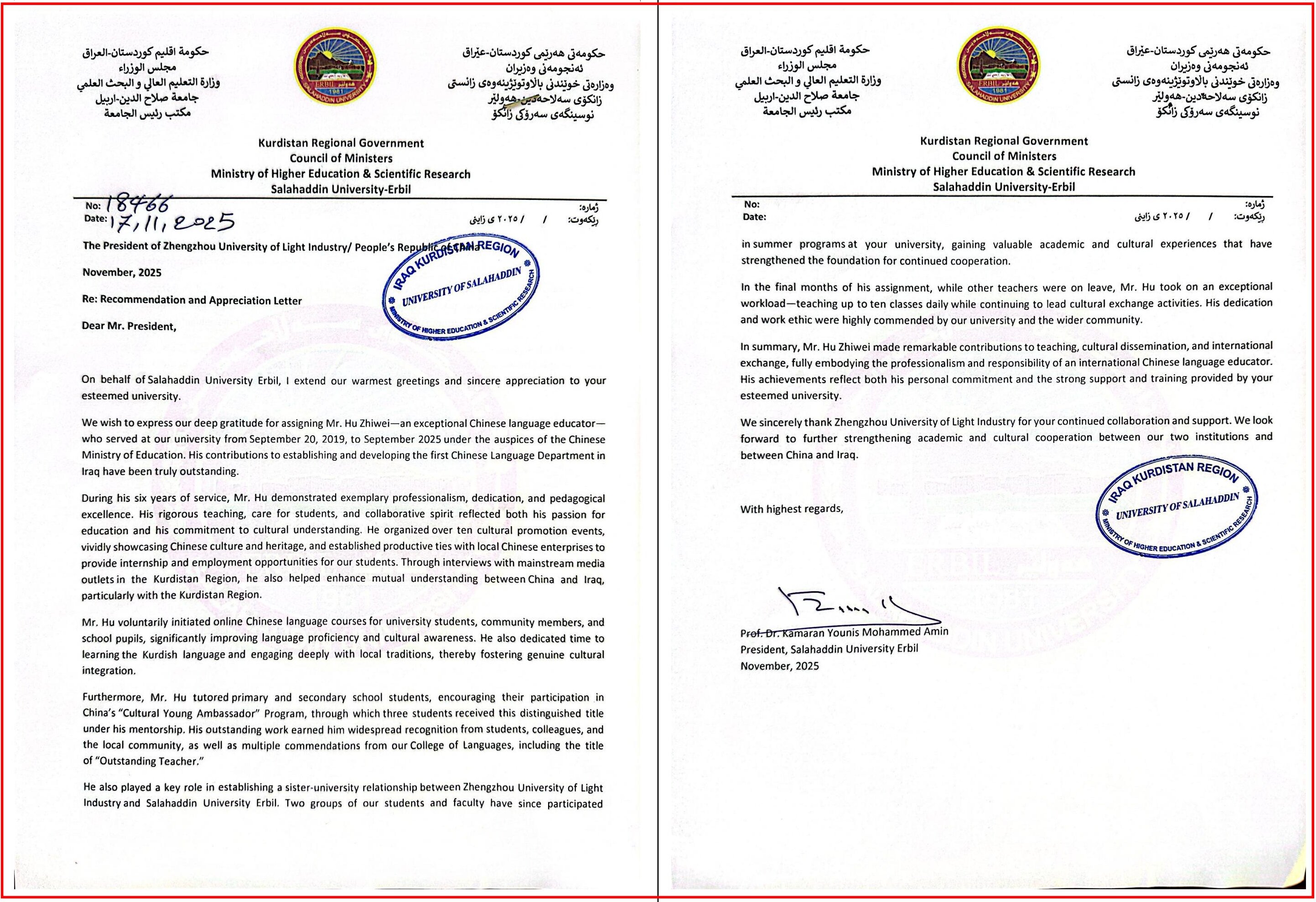 近日,伊拉克埃尔比勒萨拉赫丁大学致函我校,高度肯定我校选派赴伊拉克任教的国际中文教师胡志伟六年工作成就,感谢其为中伊文化交流与两校合作做出的突出贡献。