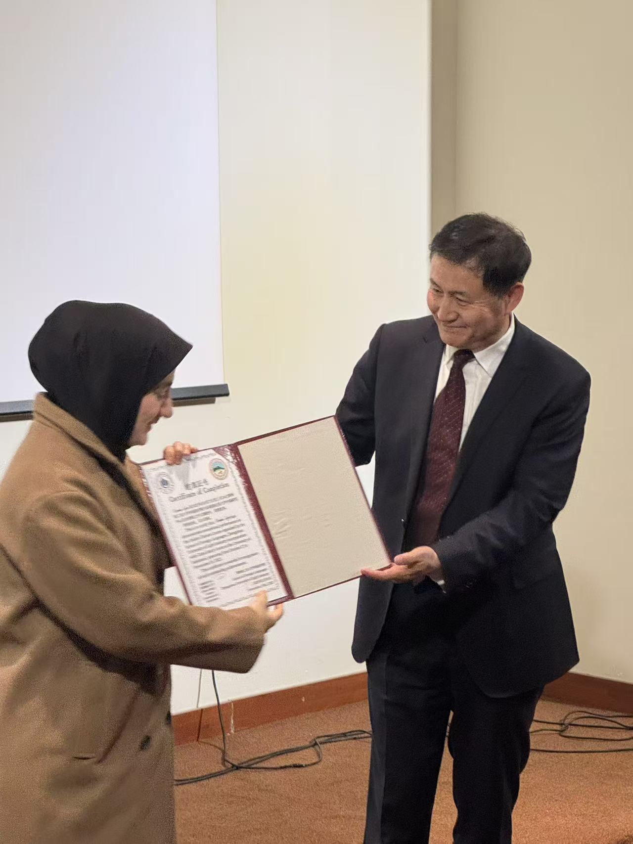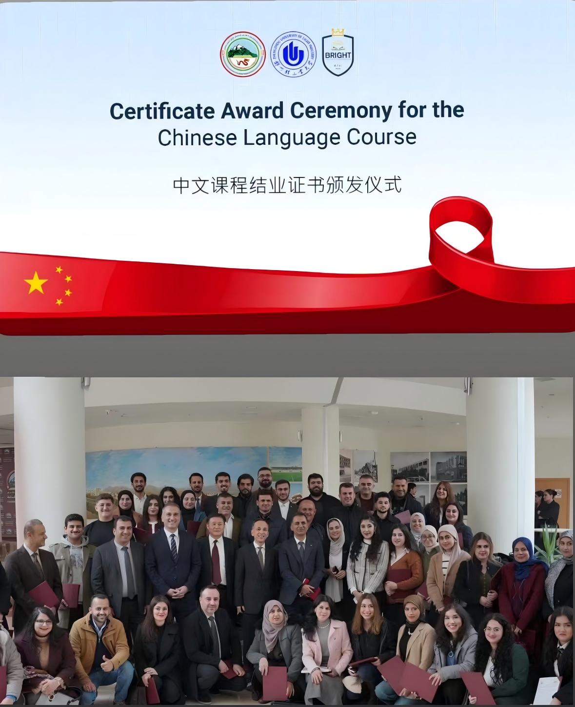 2026年1月13日,伊拉克苏莱曼尼大学媒体中心洋溢着欢快的气氛,中国研究中心短期中文课结业仪式在此隆重举行。我校与该中心合作开展的线上中文课程培训圆满结束,约70名学员顺利完成学业,获得结业证书。苏莱曼尼大学校领导科萨尔、中国驻埃尔比勒总领馆总领事刘军出席仪式,并为优秀学员颁发证书,共同见证中伊教育交流的又一重要成果。